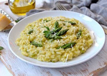 Servez immédiatement, décoré de copeaux de parmesan, de persil et de pointes d'asperges.